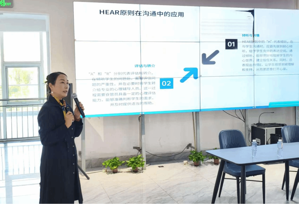 为全方位提升后勤服务人员对学生心理问题的识别与应对能力,构建更为温馨且高效的校园心理支持防线,10月21日下午,后勤管理中心与学工处携手于第三餐厅开展了后勤服务人员心理健康专题培训。此次培训由专职心理教师周敏担任主讲。